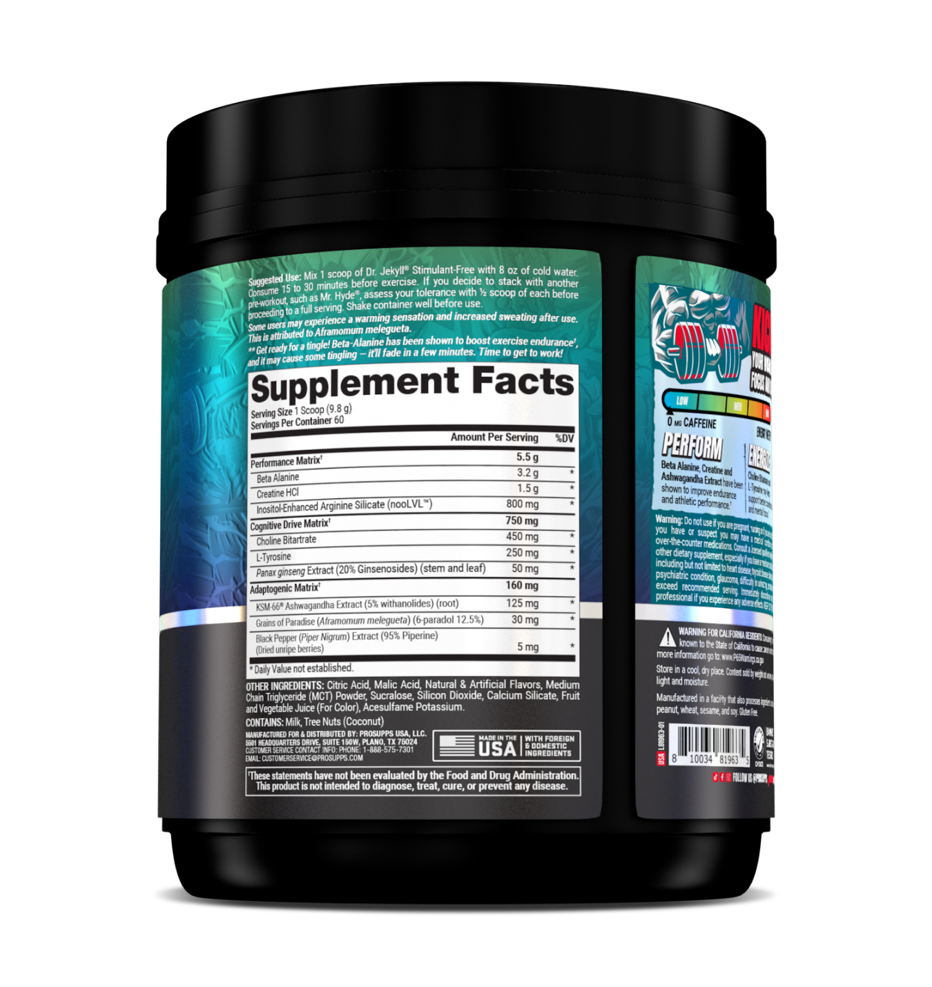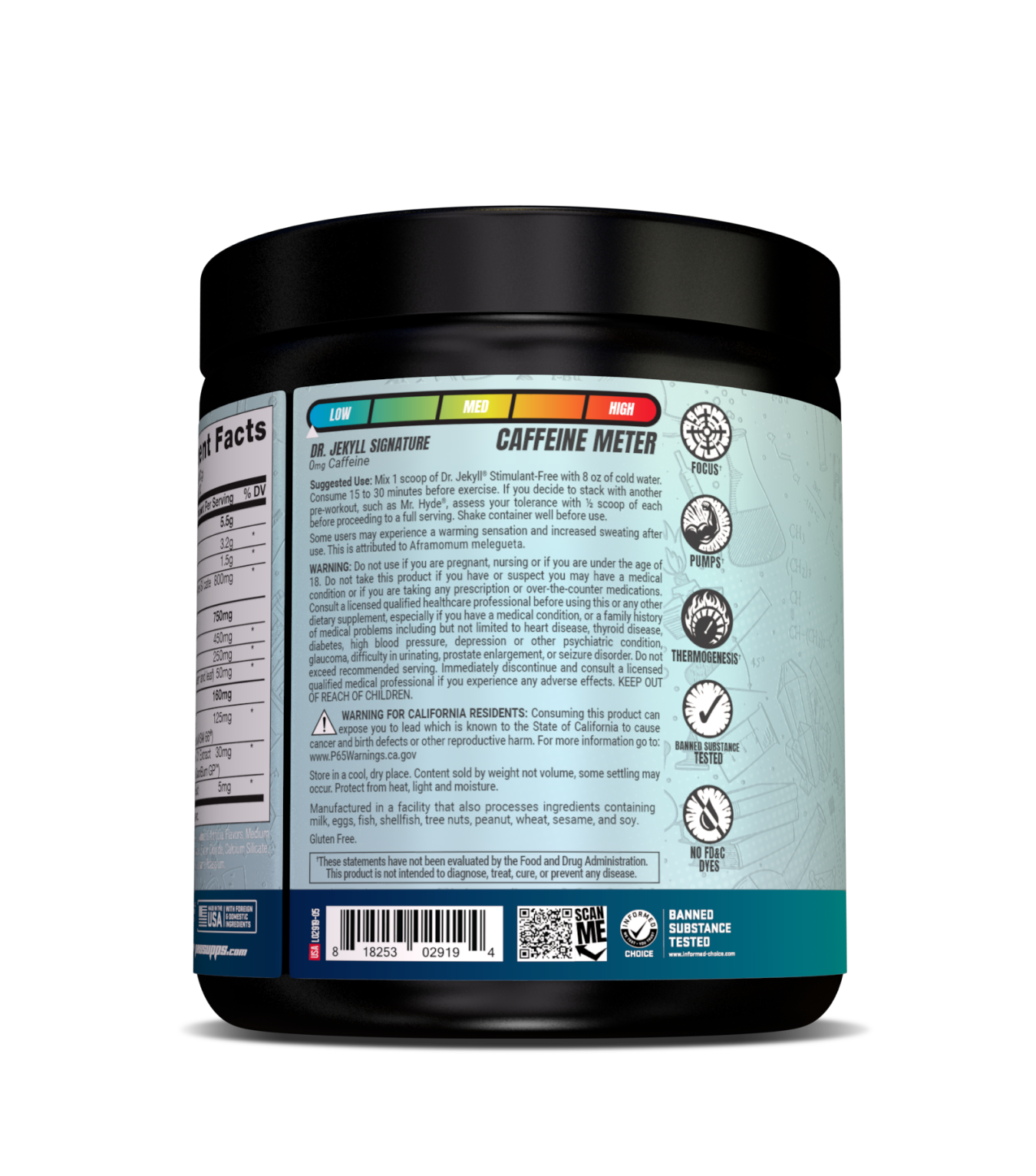 SUGGESTED USE: Mix 1 scoop of Dr. JEKYLL® Signature Stimulant-Free with 8 oz of cold water. Consume 15 to 30 minutes before exercise. If you decide to stack with another pre-workout, such as Mr. HYDE® Signature, assess your tolerance with ½ scoop of each before proceeding to a full serving. Shake container well before use. Some users may experience a warming sensation and increased sweating after use. This is attributed to Aframomum melegueta.