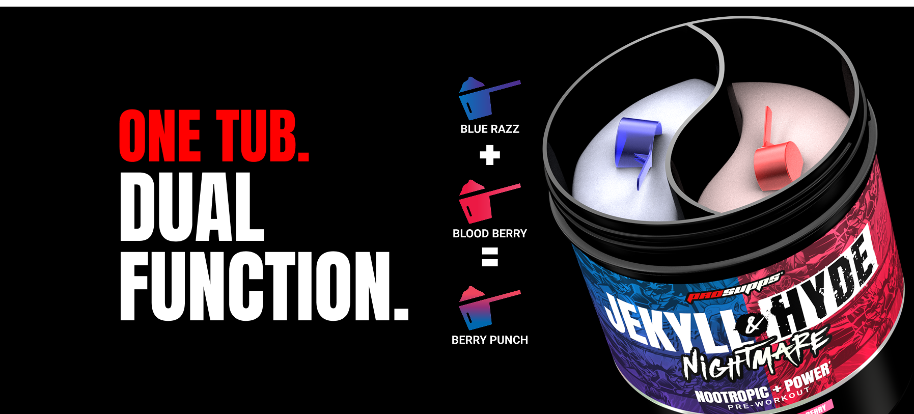 Jekyll & Hyde® Nightmare Dual Tub delivers the best of both worlds in one tub. Take Jekyll for focus and pumps, Hyde for intense energy, or stack them together for explosive performance. Powerful separately, explosive together. Master both.†