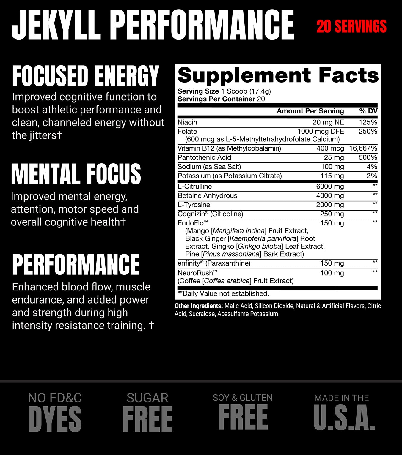 SUGGESTED USE: Mix 1 scoop of Dr. JEKYLL with 6-8oz of water. Consume 15-30 minutes prior to exercise.