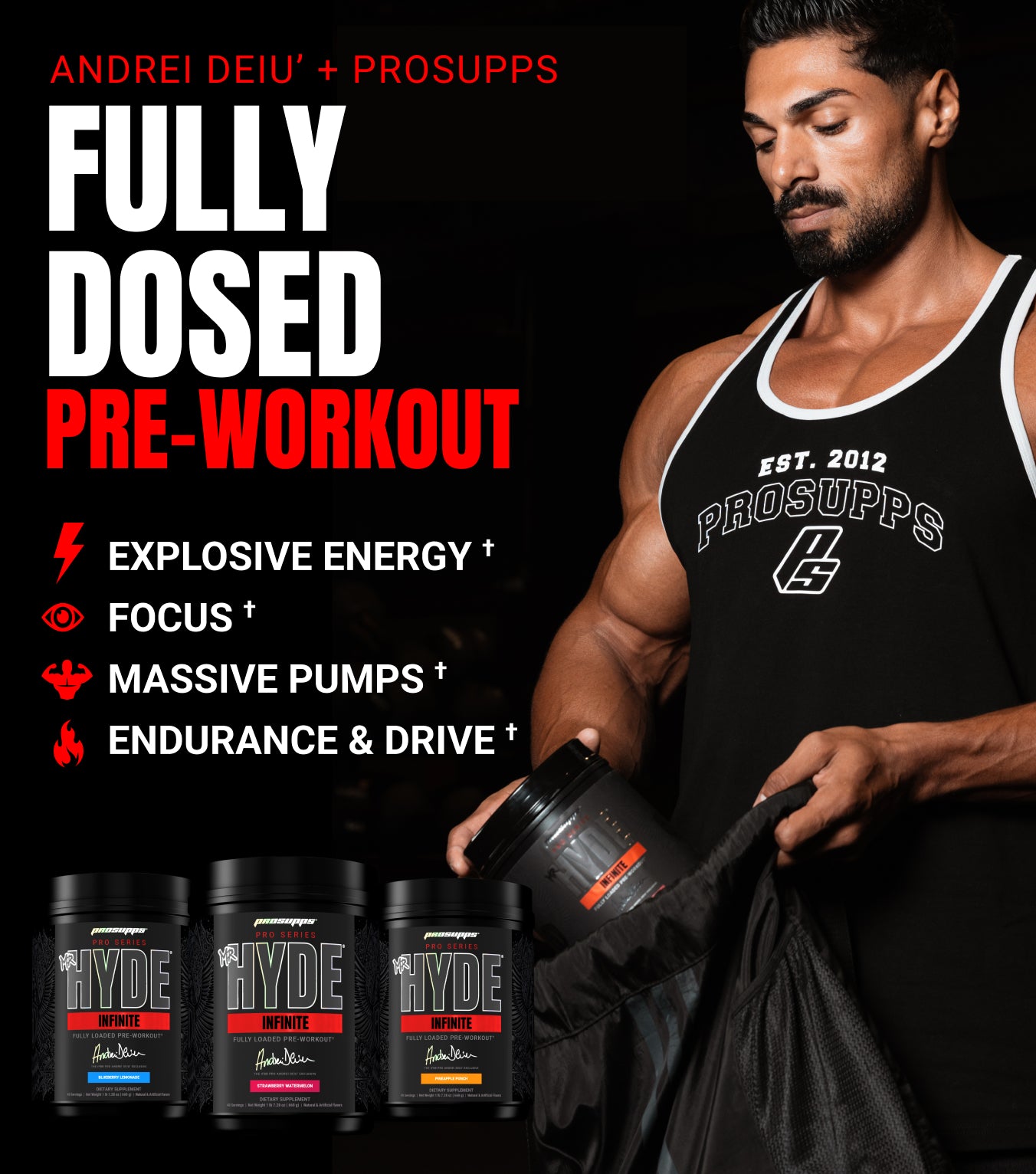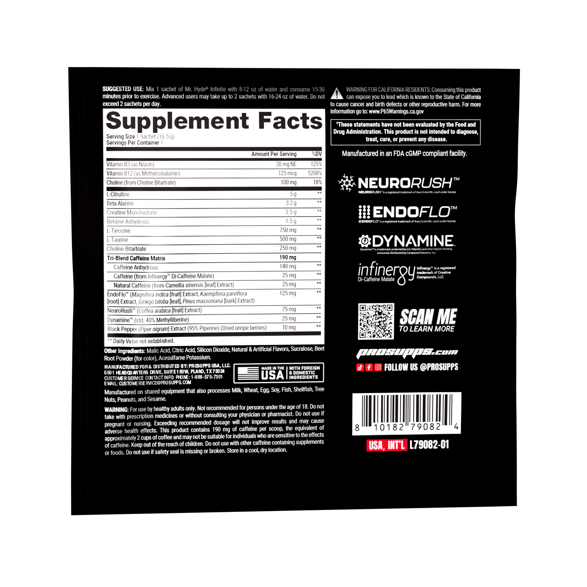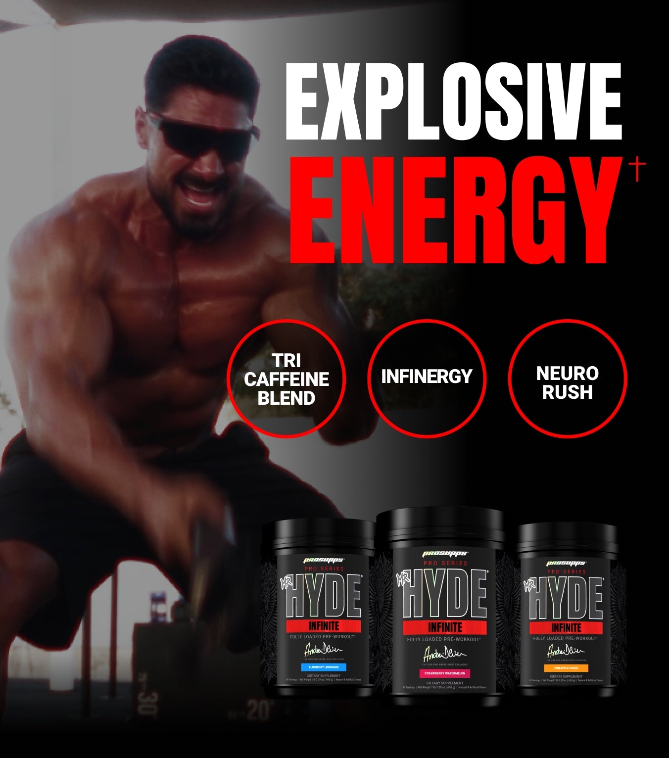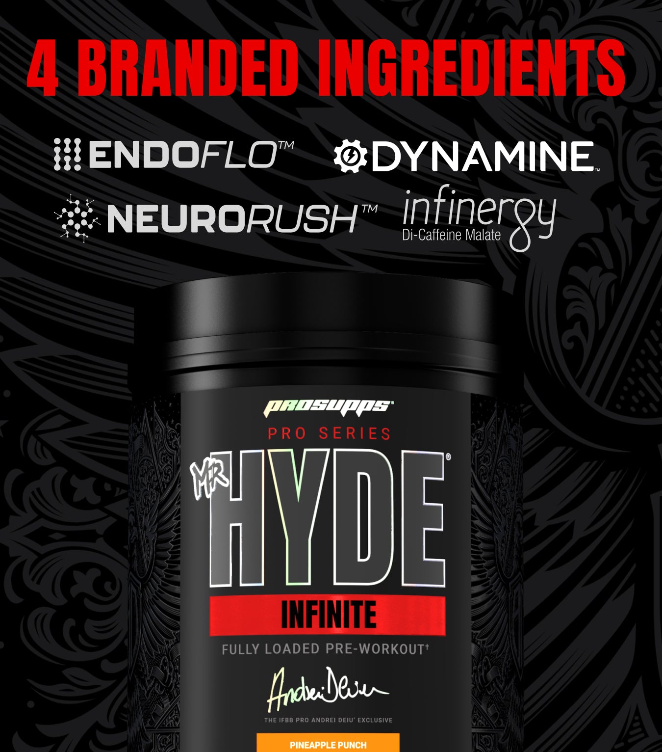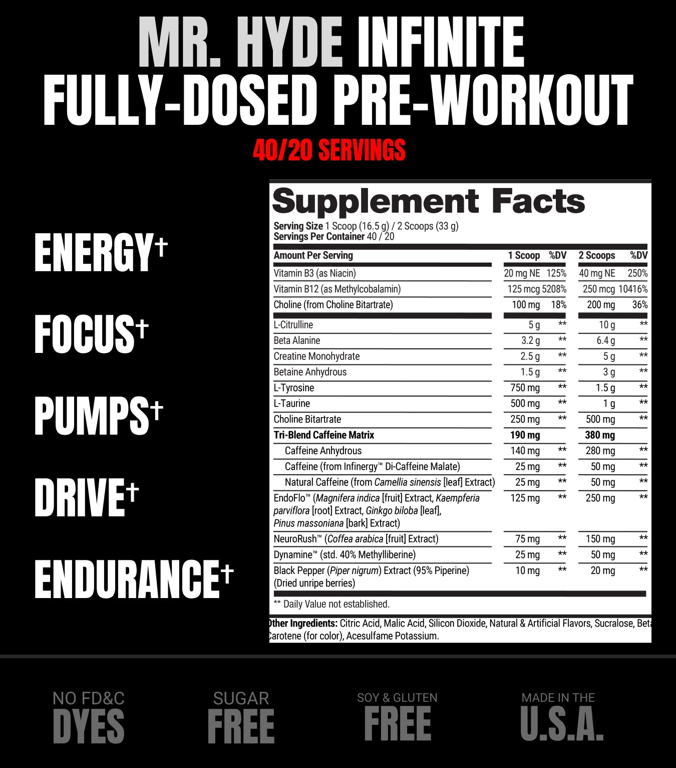 Introducing Mr. HYDE® Infinite Fully Dosed Pre-Workout- our most powerful HYDE formula yet. Packed with 10g Citrulline, 6.4g Beta-Alanine, 5g Creatine, and 380mg caffeine from a triple-source blend, it delivers infinite energy, infinite strength, and infinite focus to help you dominate every workout. This is HYDE, elevated to the Infinite level. †